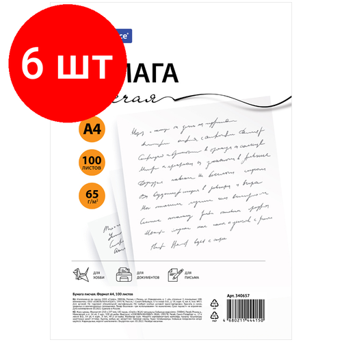 Комплект 6 шт, Бумага писчая OfficeSpace, А4, 100л, 65г/м2, 146%