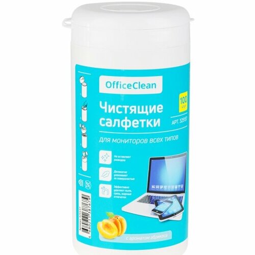 Салфетки OFFICECLEAN чистящие влажные , для мониторов всех типов, в тубе, с ароматом абрикоса, 100 шт