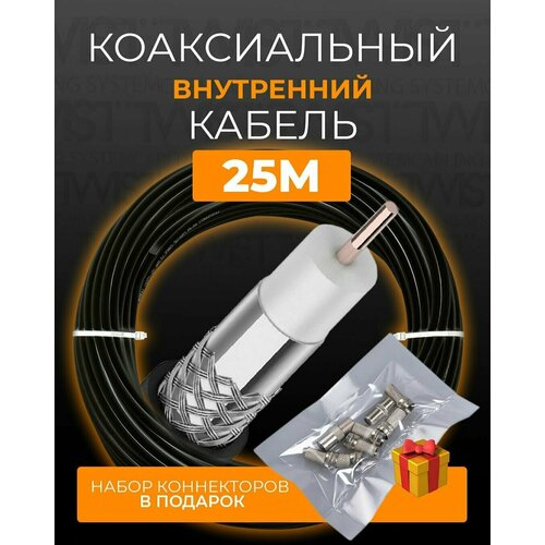 Внутренний коаксиальный (антенный телевизионный) кабель 25 метров, TWIST, CCS/Al/Al, 45% (RG6) + коннекторы, 25 м, для передачи тв и видео сигнала