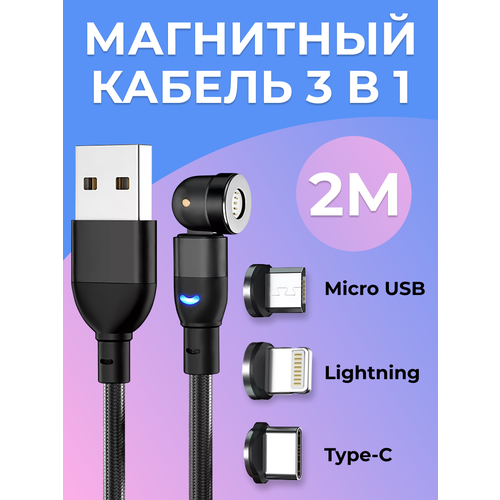 Магнитный кабель 3 в 1, провод 2м, Type-C, Lightning, Micro USB / Зарядка для iPhone, Samsung, Android / Черный