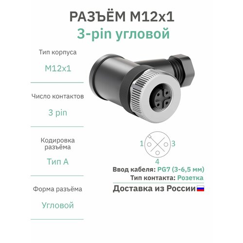 Разъём М12 3 pin угловой / розетка (мама) / PG7 (3-6,5 мм диаметр под кабель) / модель RAZM-F12-C3A