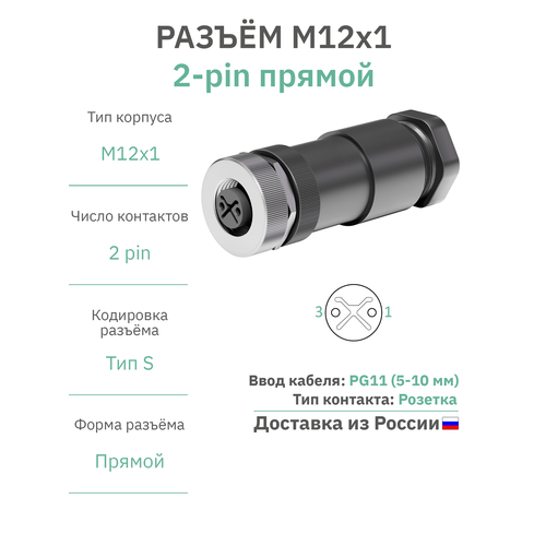 Разъём M12 S-coding 2 pin прямой / розетка (мама) / PG11 (5-10 мм диаметр под кабель) / модель RAZM-F12-C2-CODE-S-PG11