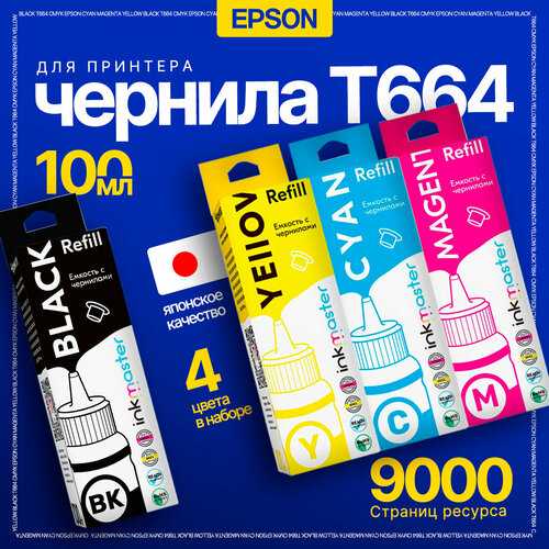 Чернила (краска) T664 для Epson L100 L110 L120 L121 L200 L210 L300 L350 L355 L550 L312 L366 L456 L486 L382 L386 тд, комплект заправки принтера 4 цвета
