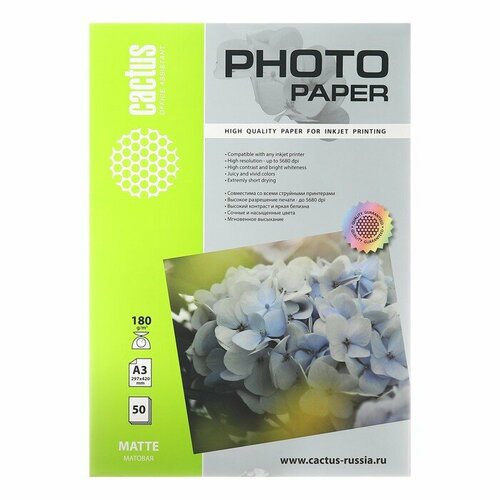 Фотобумага для струйной печати А3, 50 листов Cactus, 180 г/м2, односторонняя, матовая