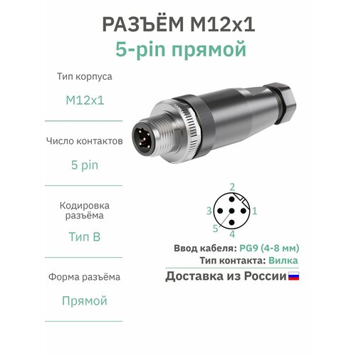 Разъём М12 B-coding 5 pin прямой / вилка (папа) / PG9 (4-8 мм диаметр под кабель) / модель RAZM-M12-C5-CODE-B-PG9