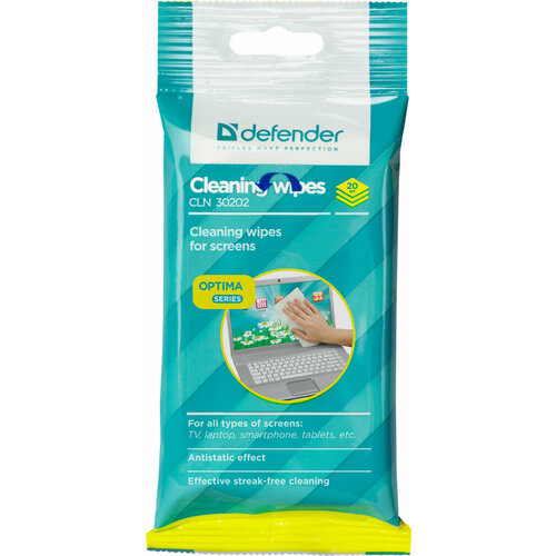 Defender Салфетки для экранов Defender CLN 30202 Optima, пакет с подвесом влажные салфетки+сухие салфетки 20 шт. для экрана, для оргтехники, 180x110 мм, 200 мл, белый