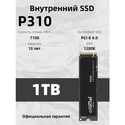 Crucial Встроенный твердотельный накопитель P310 1TB SSD Интерфейс M.2 (NVMe PCIe4.0*4) скорость чтения 7100 МБ/с