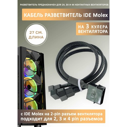 Кабель переходник/разветвитель на 3 кулера/вентилятора с IDE MOLEX. Удлинитель, 27см в оплетке