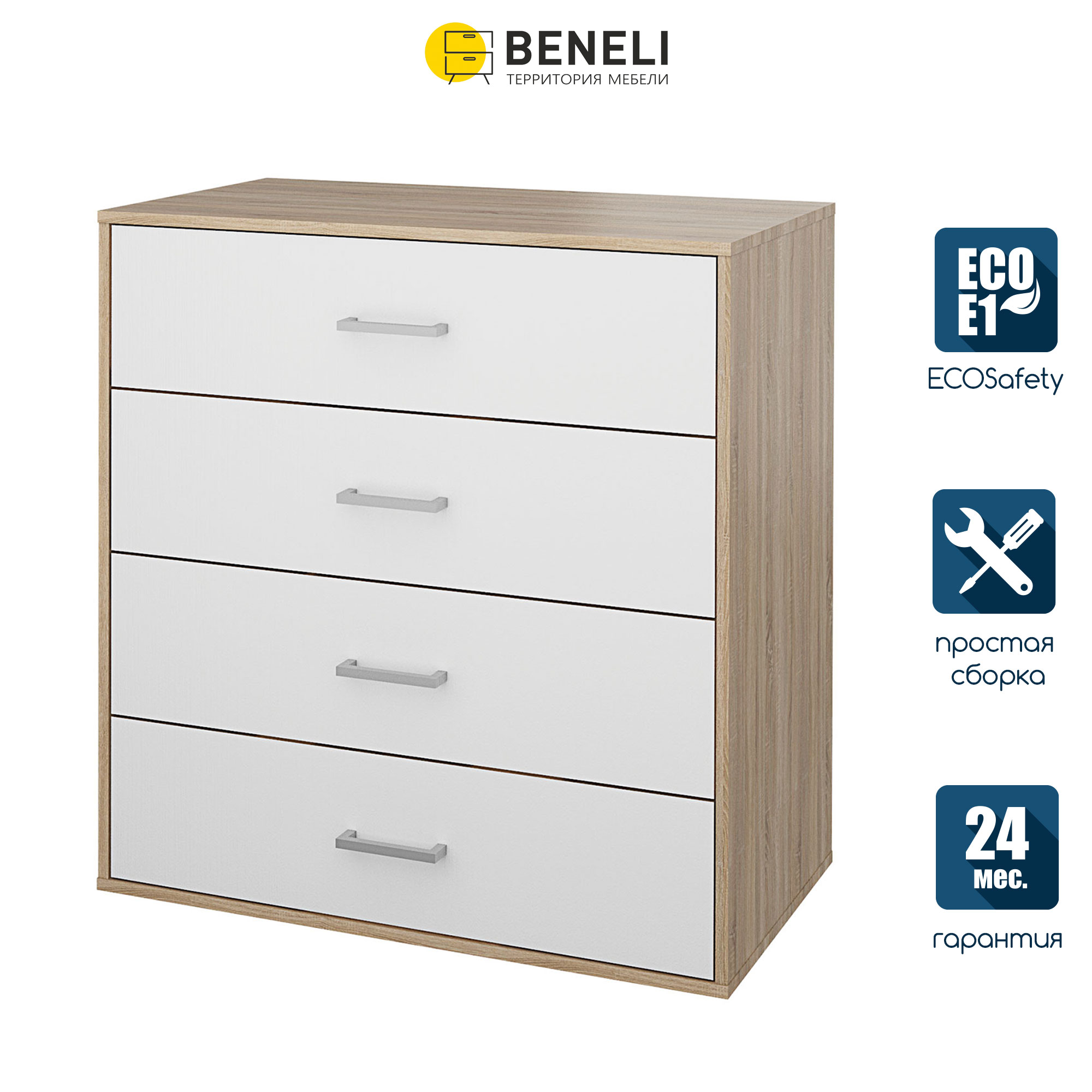 Комод Beneli ДЖАДД, 4 ящика, Белый/Дуб сонома, 79х44,3х91,6 см, 1 шт. Джадд