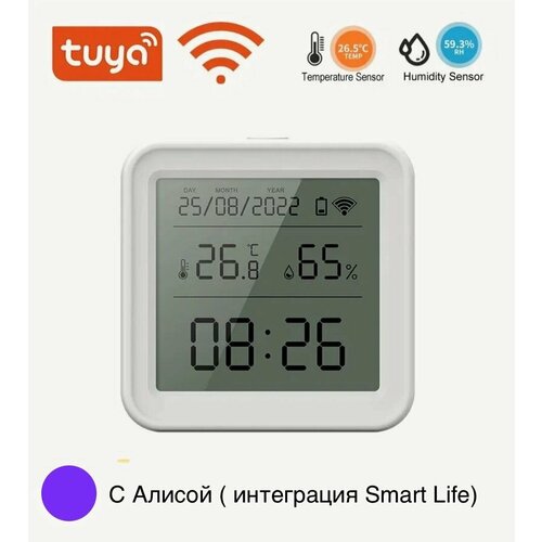 Датчик температуры и влажности. С Алисой через Smart Life. Гигрометр. WiFi.+Батарейки. Дисплей черно-белый. Календарь