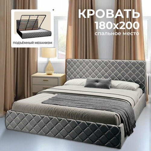 Двуспальная кровать 180х200 см с подъемным механизмом Валенсия для дома и спальни, вельвет темно-серый, Ами Мебель