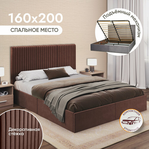 Двуспальная кровать 160х200 см с подъемным механизмом Валенсия для дома и спальни, вельвет коричневый, Ами Мебель