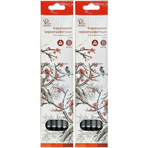 АРТформат набор чернографитных карандашей 6 шт, 2Н-8В, заточенные, трехгранные, 6 оттенков серого, 2уп.