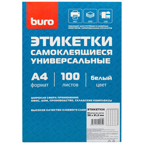 Этикетки Buro A4 38x21.2мм 65шт на листе/100л./белый матовое самоклей. универсальная 100043679917
