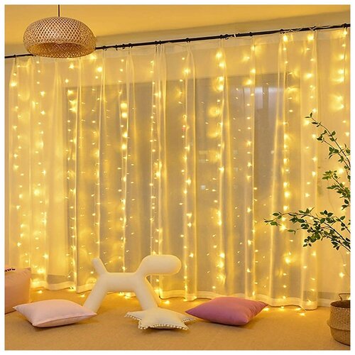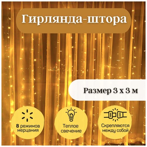 Гирлянда электрическая светодиодная 3х3 м. желтая / Гирлянда штора занавес новогодняя