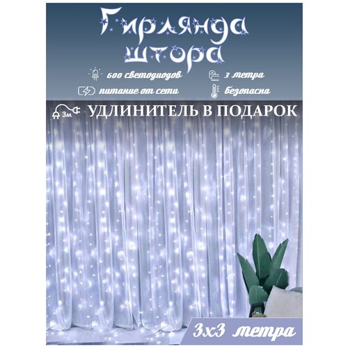 Гирлянда электрическая светодиодная 3х3 м. Белая / Гирлянда штора занавес новогодняя