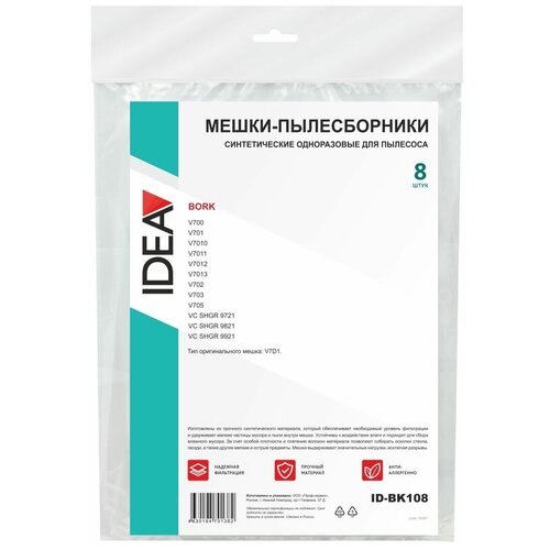 Мешки пылесборники для пылесоса Борк тип V7D4 сменные синтетические совместимые с BORK V706 V707 V708 V709, IDEA ID-BK208 одноразовые 8 шт в упаковке