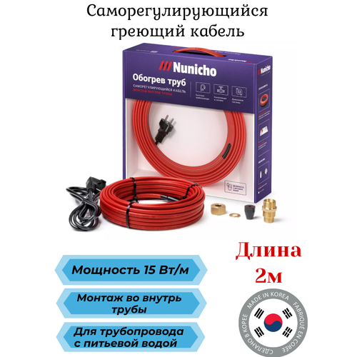 Саморегулирующийся греющий кабель Nunicho Micro 15вт, длина 2м, готовый комплект с вилкой и сальником 3/4