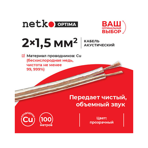 Кабель акустический 2x1.5мм2 (7x19x0.12мм), чистая медь, пластиковая катушка, Netko, 80 метров