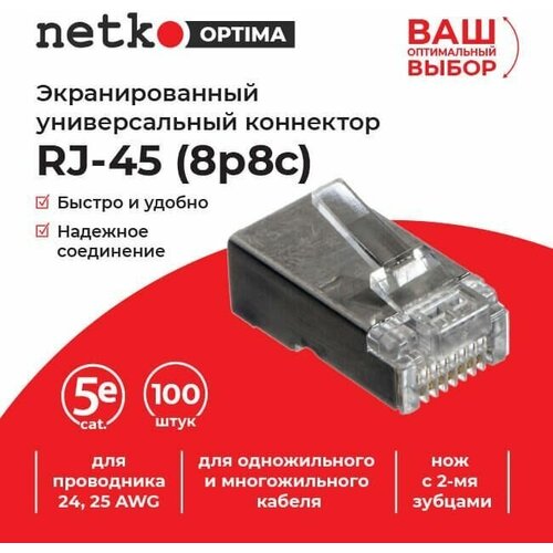 Коннектор RJ45 (8p8c) cat.5е, экранированный, универсальный, 100шт, NETKO