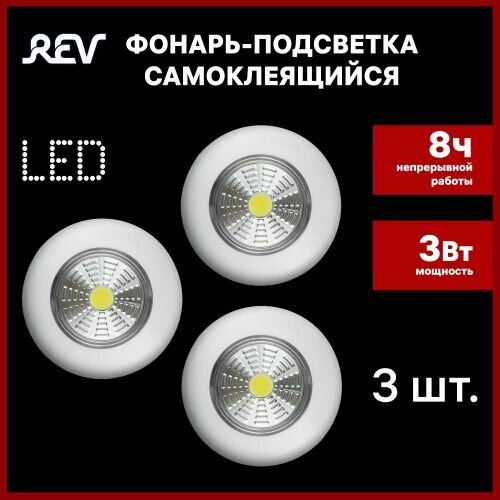 Светодиодный самоклеящийся фонарь-подсветка 3 штуки REV Pushlight 3Pack белый, COB 3 Вт, бат. 3xAAA
