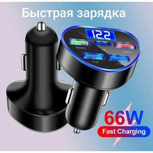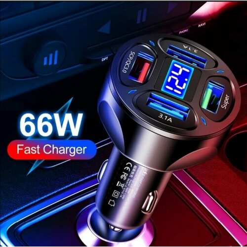 Автомобильное зарядное устройство с вольтметром / 4 USB порта + Type-C / , быстрая автомобильная зарядка для телефона 12-24 QC3.0 12-24 вольт