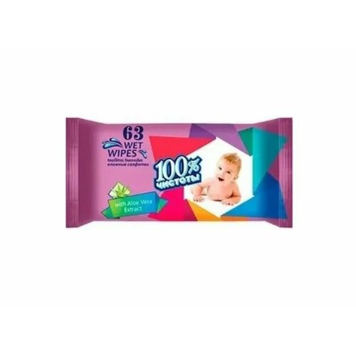 Влажные салфетки ТМ 100% Чистоты для детей с экстрактом Алоэ (63шт х уп)