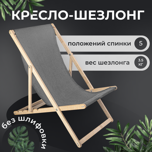 Кресло-шезлонг "Берёзка" без шлифовки с серой тканью складной для дома и дачи