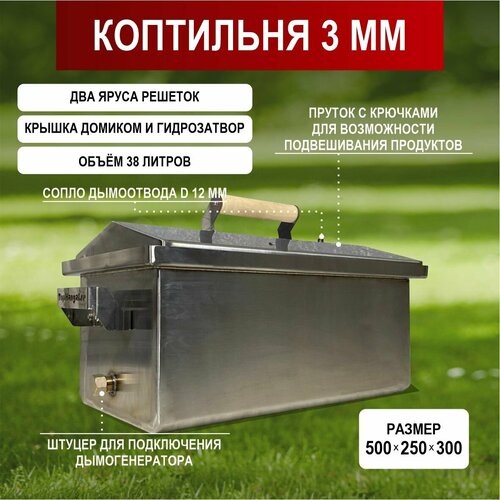 Коптильня горячего и холодного копчения 2 мм с датчиком. С гидрозатвором. Крышка домиком. Размер: 500*250*300