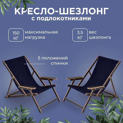 Кресло-шезлонг с подлокотниками для дома, для дачи, складной с темно-синей тканью без шлифовки, комплект 2 шт