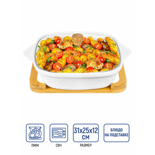Блюдо для запекания 2 л Elan Gallery Снежинки со стеклянной крышкой, на деревянной подставке