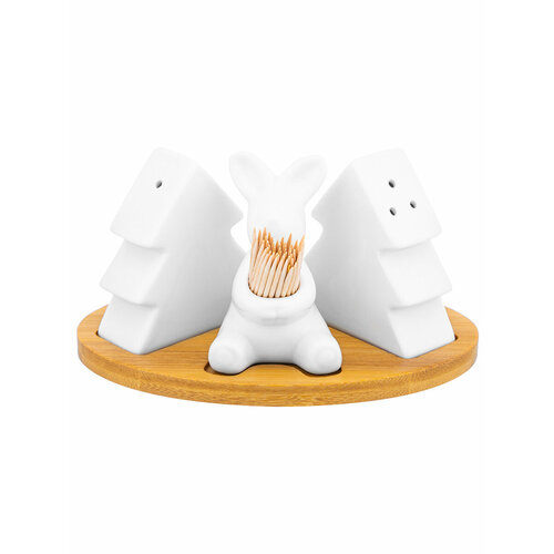 Вазочка под зубочистки и набор для специй 3 предмета 45 мл 15,5х9,5х8,5 см Зайка в елочках Elan Gallery на деревянной подставке