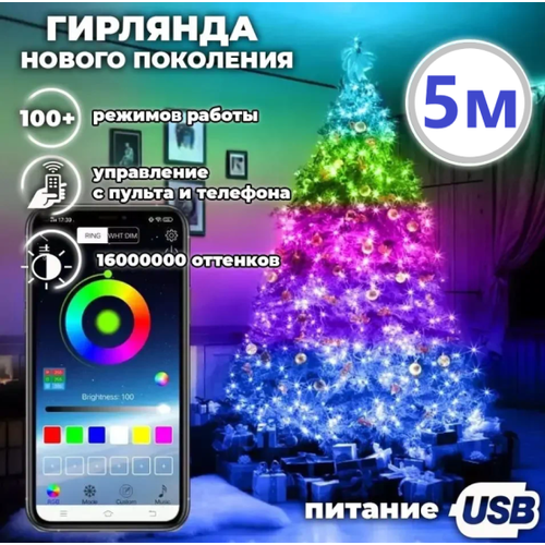 Умная светодиодная гирлянда роса для дома и улицы 5 метров/50 ламп. Управление с телефона + с пульта ДУ. Влагозащищеная IP65. Питание от USB.