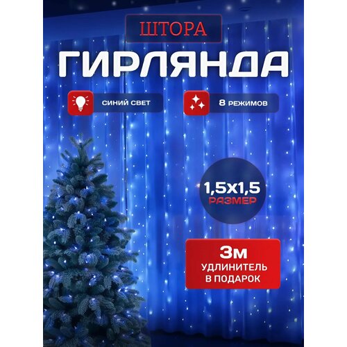 Новогодняя гирлянда-штора 1.5х1.5 с удлинителем в подарок, свет