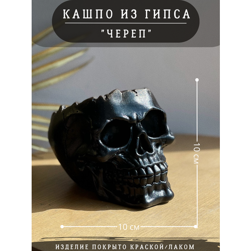 Кашпо из гипса Череп анатомический в черном цвете с золотом, 15 см, органайзер