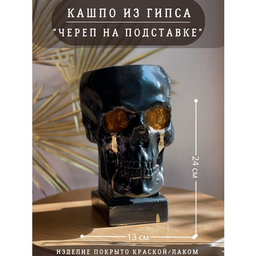 Кашпо "Череп натуральный" в черном цвете с золотым дизайном, органайзер, 24 см