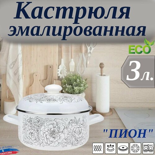 Кастрюля эмалированная 3 л с рисунком, белая пион