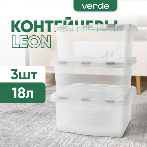 Контейнер для хранения VERDE прозрачный 18л, комплект 3 штуки
