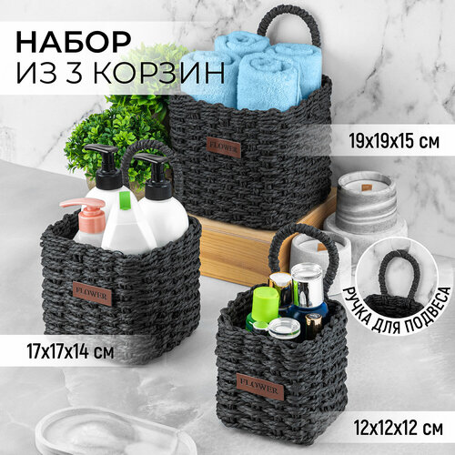 Набор из 3-х плетеных корзин El Casa "Flower" для хранения мелочей, графит