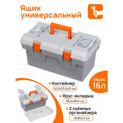 Ящик для инструментов 16 л 40,5х23,5х21 см EL Casa Массимо с крышкой с 2-мя защелками и 2-мя органайзерами, с вкладышем, серый