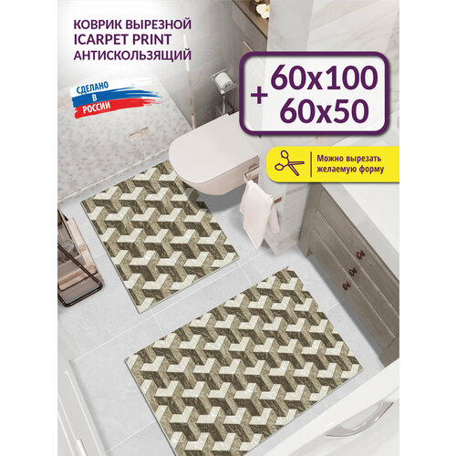 Набор ковриков для ванной и туалета вырезных антискользящих Icarpet PRINT 60х100 + 60х50 Иллюжн бежево-коричневый 140