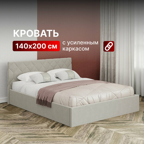 Кровать 140х200 с подъемным механизмом двуспальная Техас с ортопедическим основанием и ящиком для белья, мягкое изголовье, для спальни и дома, велюр с светло-бежевый