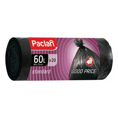 Мешки для мусора 60 л, комплект 5 шт, черные, в рулоне 20 шт, ПНД, 7.4 мкм, 60х72 см, PACLAN "Standard"