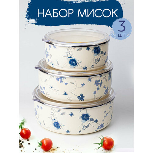 Набор 6пр.(миски эмалир, 0,65/0,8/1,0л) Ситец, с крышками, Катюша, арт.7022-3