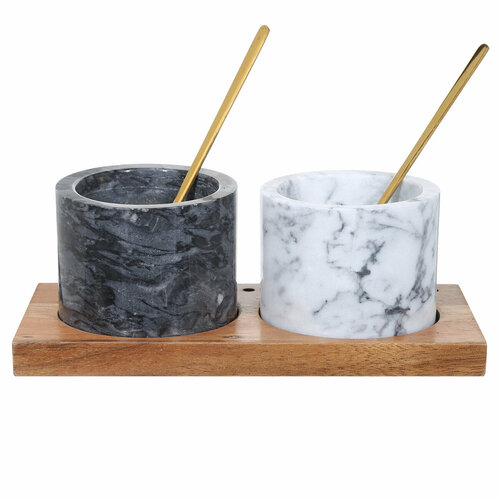 Емкость для сыпучих продуктов, 2 шт, на подставке, с ложками, мрамор/дерево, Marble