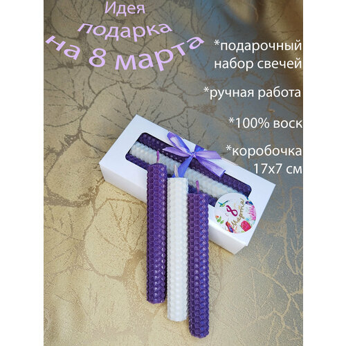 белый, фиолетовый, белыйОригинальный подарок к международному женскому дню 8 марта. Набор свечей ручной работы из вощины - бюджетный подарок на 8 марта для женщины, девушки. В набор входят 2 восковые свечи 8х3 см (+-3 мм) . Свечи изготовлены из цветной вощины (пасечный пчелиный воск с добавлением натуральных жирорастворимых импортных красителей и ароматизаторов). Порадуйте свою подругу, маму, сестру или коллегу, подарив эксклюзивный недорогой подарок ручной работы. Декоративные свечи из вощины будут не только украшением комнаты, но и пригодятся в хозяйстве. Оригинальный набор свечей ручной работы не останется незамеченным, это неповторимый сувенир, недорогой подарок ручной работы. В комплект входит подарочная коробка с наполнителем, рекомендации по использованию. На странице нашего бренда DREAM_CANDLES (кликните на логотип) есть подарки на день рождения, новогодние подарки на Новый год, новогодний декор, свадебный подарок, наборы свечей на праздники 14 февраля, День рождения, 23 февраля, Пасху, 8 марта, Новый год для мужчины, му