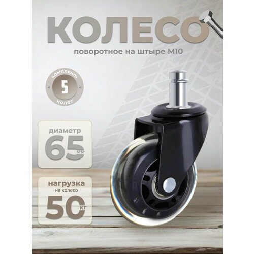 Колесо для офисного и руководительского кресла IKEA поворотное 65 мм на штыре M10 BRANTE, комплект 5 шт, для паркета и ламината, колесики для компьютерного стула, ролики для мебели