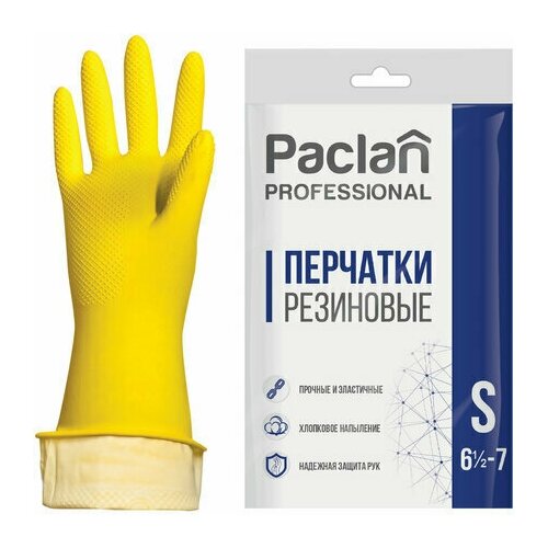 Перчатки хозяйственные латексные, комплект 30 шт, х/б напыление, размер S (малый), желтые, PACLAN Professional