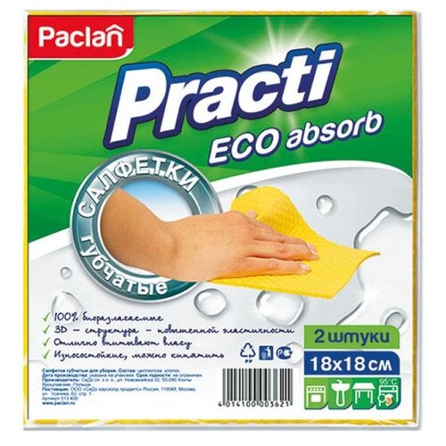 Салфетки для уборки. губчатые Paclan Practi Eco Absorb 18 x 18 см, 2 шт, хозяйственные, целлюлозные