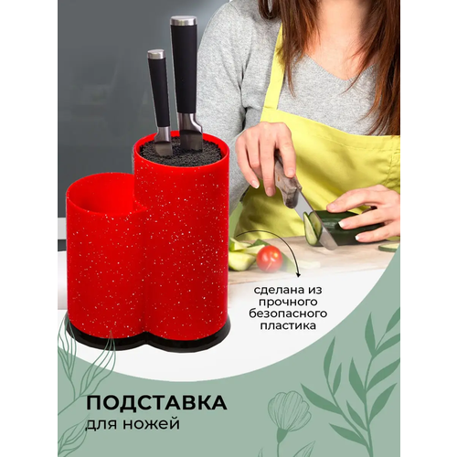 красныйОрганайзер для кухни Wilker универсальная подставка для ножей, столовых приборов и кухонных принадлежностей, которая обеспечивает в первую очередь удобное и безопасное хранение режущих лезвий лезвий ножей и ножниц. С ее помощью вы сможете организовать ножевой арсенал и другие кухонные принадлежности на вашей столешнице, экономя место и время при приготовлении пищи. Ножовница устойчивая, не будет опрокидываться под весом кухонных приборов. Одним из главных преимуществ тройной подставки для кухонных ножей Wilker является ее функциональность. Эта подставка является не только подставкой для ножей, но и органайзером для кухонных и столовых приборов. Вы можете использовать ее для хранения и сушки ножей, вилок, ложек и других кухонных принадлежностей. Благодаря своим размерам 23х22 см, она легко помещается на кухонной столешнице и не занимает много места. Тройная форма подставки позволяет разместить на ней до 8 ножей, обеспечивая доступность каждого из них. Еще одним преимуществом подставки для ножей с наполнителем